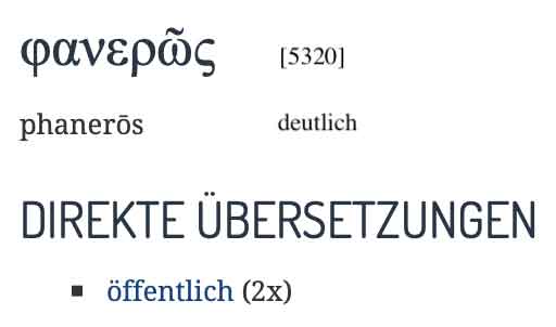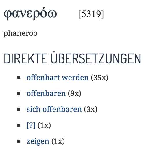 Auffallend ist, dass pavepóo 9-mal in einem polemischen Kontext im 2. Korintherbrief vorkommt, wo Paulus möglicherweise eines der Schlagworte seiner Gegner verwendet. „Durch uns offenbart Er den Duft seiner Erkenntnis überall“ (2,14); in Paulus Verkündigung geschieht Gottes Offenbarung also durch Jesus Christus. „Damit alle sehen, dass ihr ein Brief Christi seid, der von uns zugestellt wurde“ (3:3); „wir tragen allezeit den Tod Jesu am Leib, damit auch das Leben Jesu an unserem Leib offenbar werde“, (4:10; in seinem Leiden bezeugt Paulus eine existenzielle Nachahmung Christi); „damit das Leben Jesu an unserem sterblichen Fleisch offenbar werde“ (V. 11).